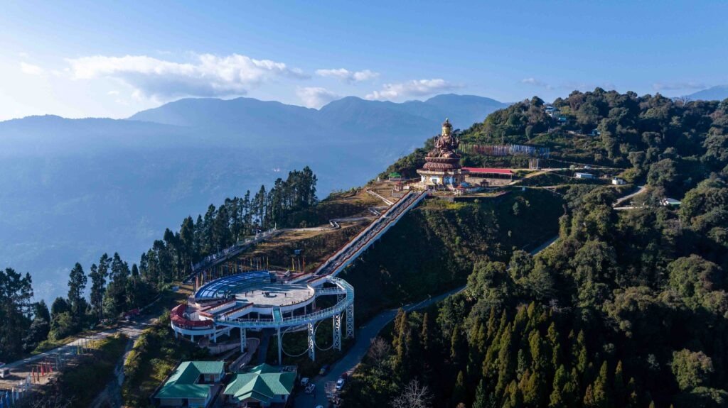Drive toward Pelling for an experience of “Sky, Stone & Scale.” Arrive at the Chenrezig Skywalk during a VIP window to avoid crowds, accompanied by a narration of the site’s cultural context.